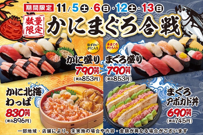 持ち帰り寿し店の「小僧寿し」「茶月」を運営する株式会社小僧寿し(本社:東京都中央区 代表取締役社長 良本 宣之)は、持ち帰り寿し店「小僧寿し」にて、11月5日(土)~6日(日)・12日(土)~13日(日)の期間限定で、『かにまぐろ合戦』を開催致します。