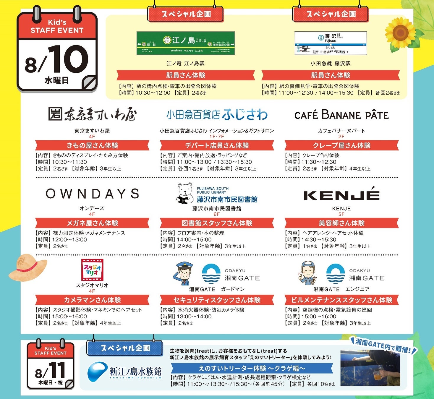 本年開催する「おしごと体験イベント」では、物販店・飲食店などのショップスタッフのほか、インフォメーション・ガードマン・クリーニングスタッフ・エンジニアなどのショッピングセンター業務や駅員業務だけでなく、湘南を代表するレジャー施設「新江ノ島水族館」の協力による飼育員体験など、6施設合計で全112メニュー、339名のお子さまにお楽しみいただけます。お子さまは多彩な業種のなかから「おしごと」を選択し応募いただけます。