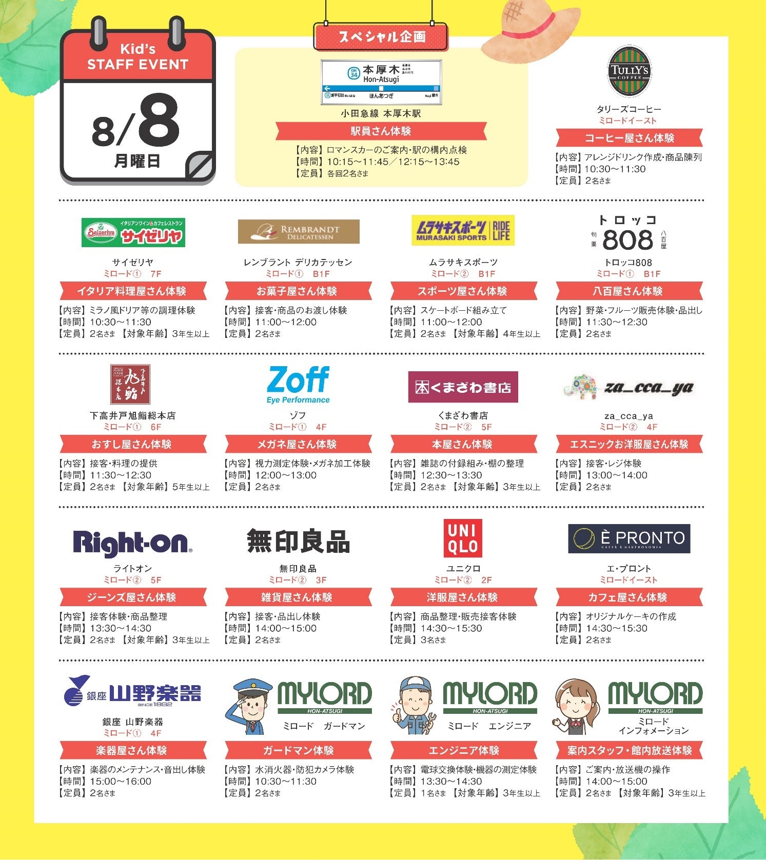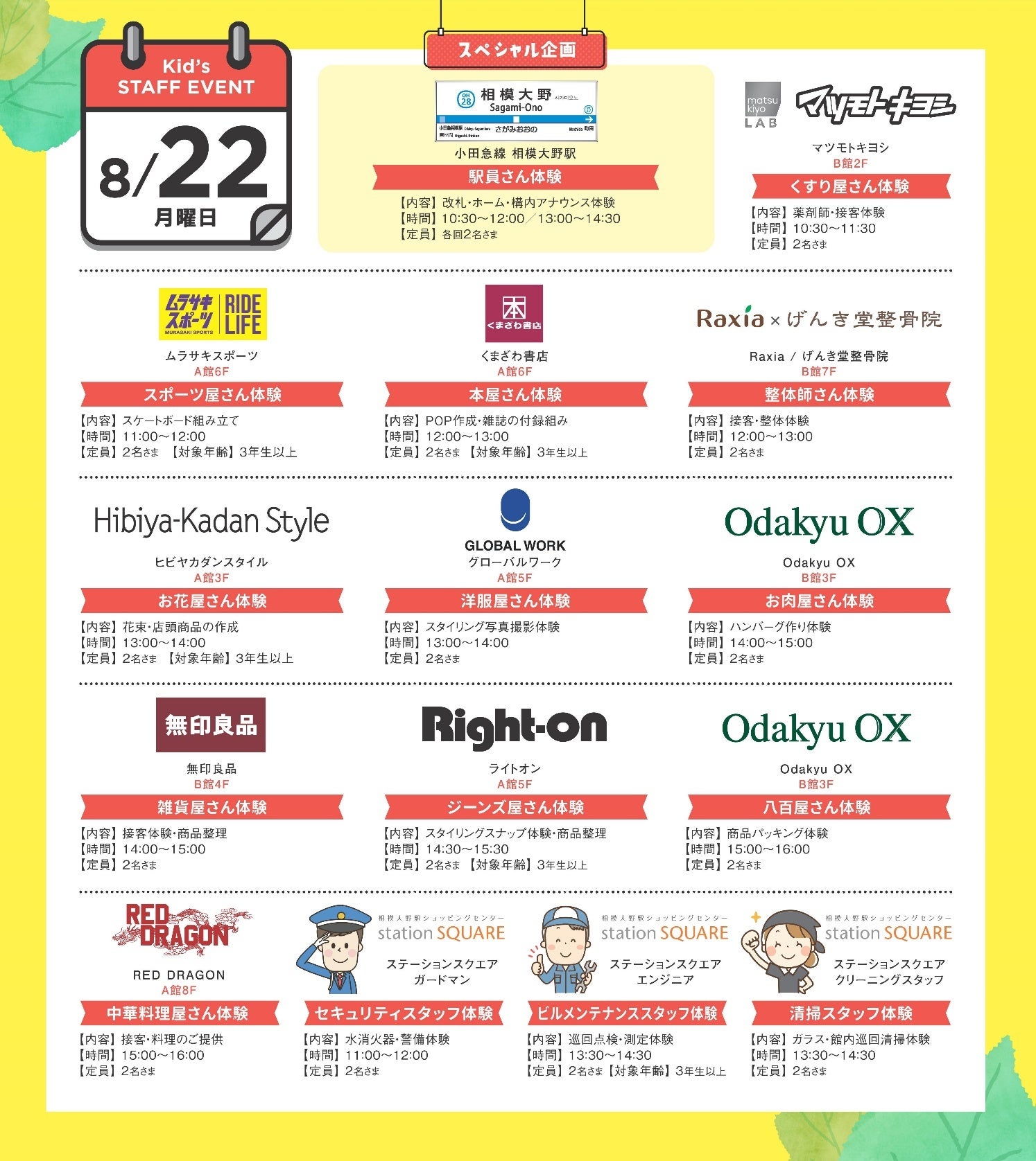 小田急沿線の6つのショッピングセンターの物販店・飲食店など79のショップのほか、インフォメーション・ガードマン・クリーニングスタッフ・エンジニアなどのショッピングセンター業務や駅員業務、「新江ノ島水族館」ご協力による飼育員体験などを含め全112種の多彩な職種をご用意し、接客や商品陳列、POP作成、ご案内などの業務を合計339名さまに体験いただけます。ご参加いただいた方にはお土産として、「お給料(対象施設の商品券500円分)」を進呈します。