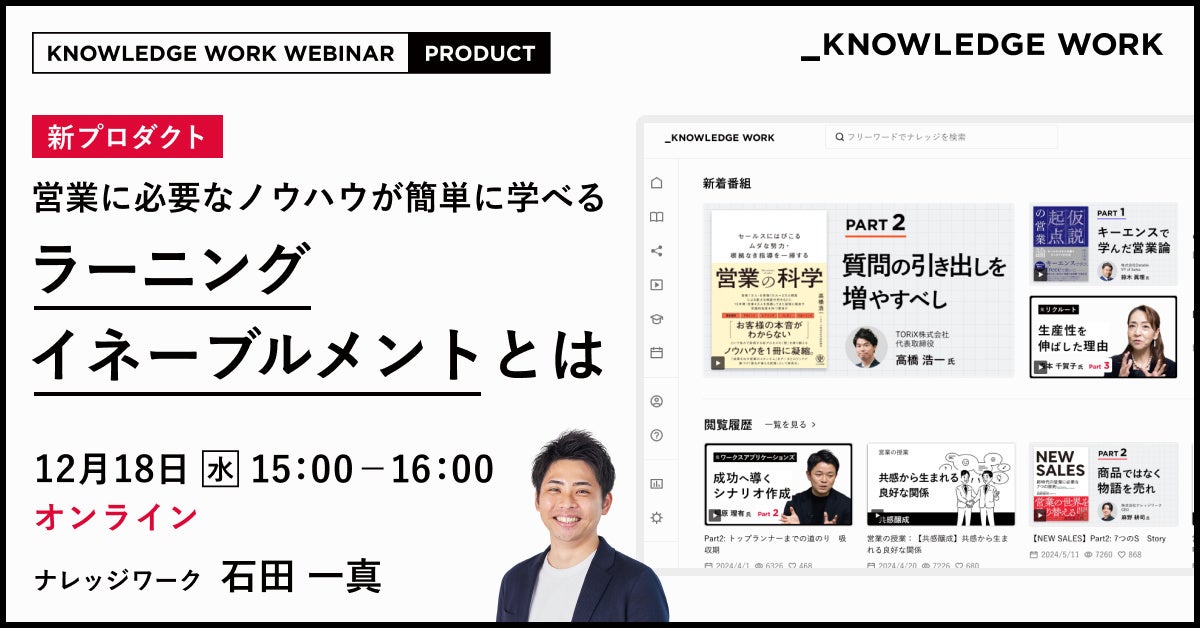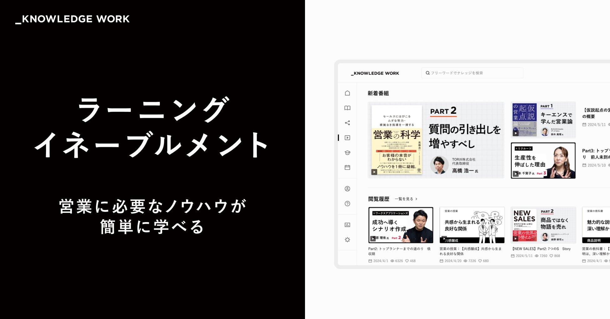 「できる喜びが巡る日々を届ける」をミッションに掲げる株式会社ナレッジワーク(本社:東京都港区、CEO 麻野耕司)は、営業向けに「体系的」「実践的」なノウハウの学習環境を提供する新プロダクト「ラーニングイネーブルメント」をリリースいたしました。