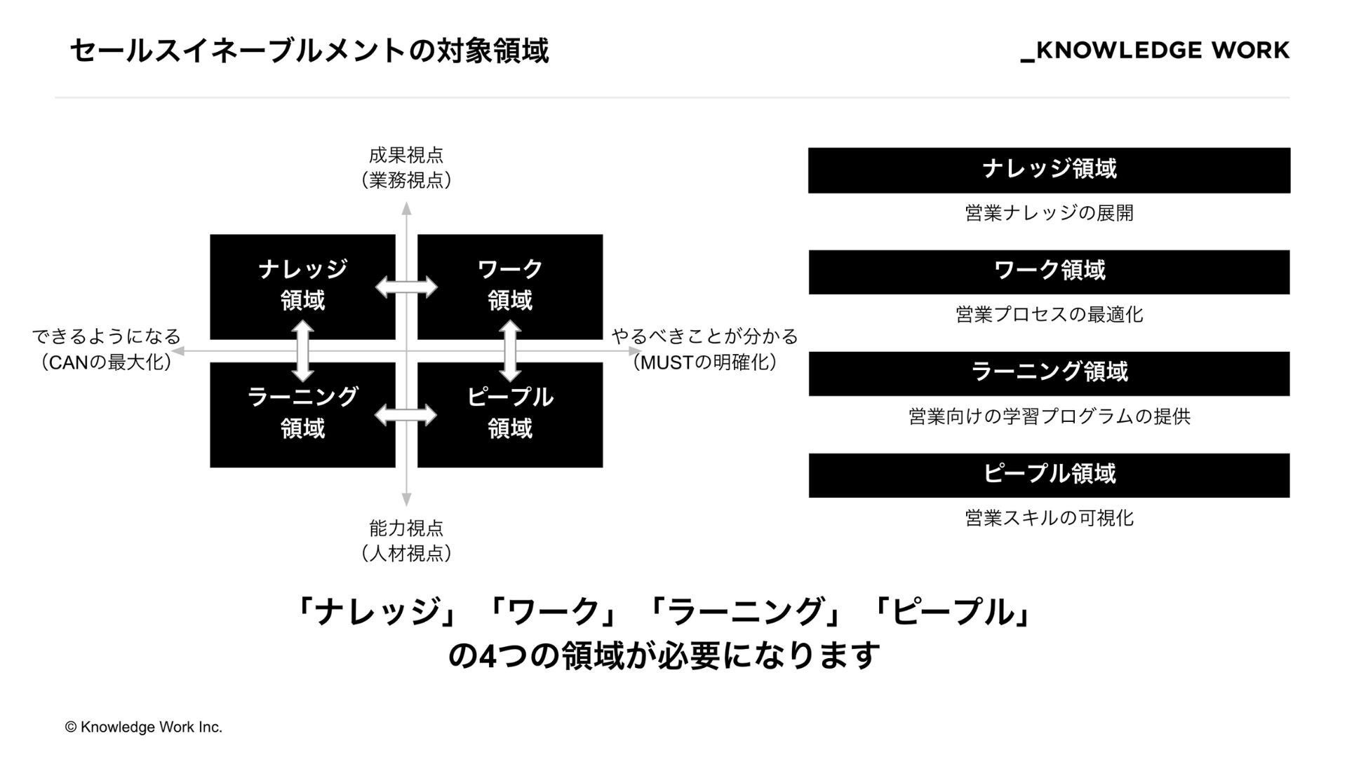 「ナレッジワーク」は、セールスイネーブルメントの実現を目指しています。セールスイネーブルメントは、「ナレッジ」「ラーニング」「ワーク」「ピープル」の4つの領域で構成されています。今後は、「ワーク」や「ピープル」を含むすべての領域にプロダクトを展開し、営業担当の成果向上と能力向上に貢献していきます。