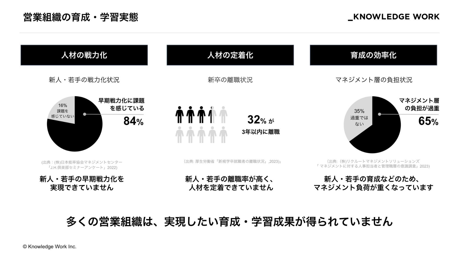 近年、多くの営業組織では、高度なスキルが求められるソリューション営業が重視され、新人や若手を中心とした育成・学習が必要となっています。しかし、実態としては、早期戦力化が進まないなど、育成や学習に課題を抱える企業が多い状況です。