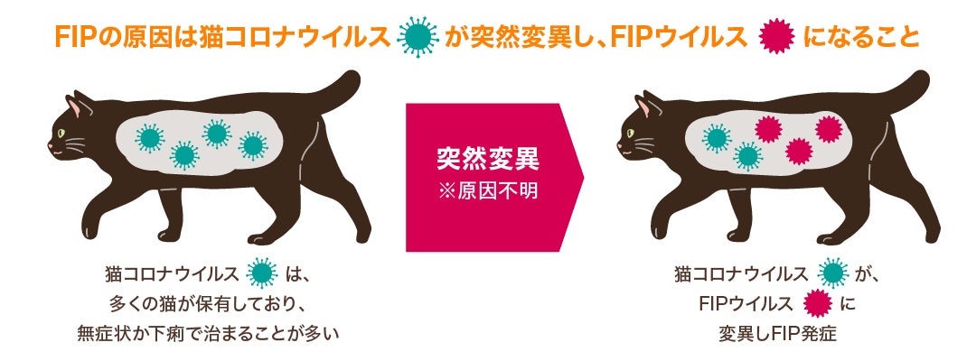 FIPはその病態から腹水や胸水が溜まる“ウェットタイプ”と内臓に肉芽腫を作る“ドライタイプ”の2つに分けられる猫の難病です。原因ウイルスは「猫コロナウイルス(FCoV)」であり、一般に多くの猫が、軽度の下痢を示すのみか、特段の症状もなく保有している可能性の高いウイルスです。しかし、ストレスや環境の変化、猫自体の免疫力の低下などに加え、何らかの要因によりウイルスが突然変異すると、強い病原性を持つ「猫伝染性腹膜炎ウイルス(FIPV)」となり、全身感染が成立することで致死性の高いFIPとして発症します。初期症状は発熱、沈うつ、食欲不振、体重減少、黄疸、腹水による腹部の膨満など様々です。3歳までの発症が多く、特に1歳未満の発症では進行スピードが早いと言われています。