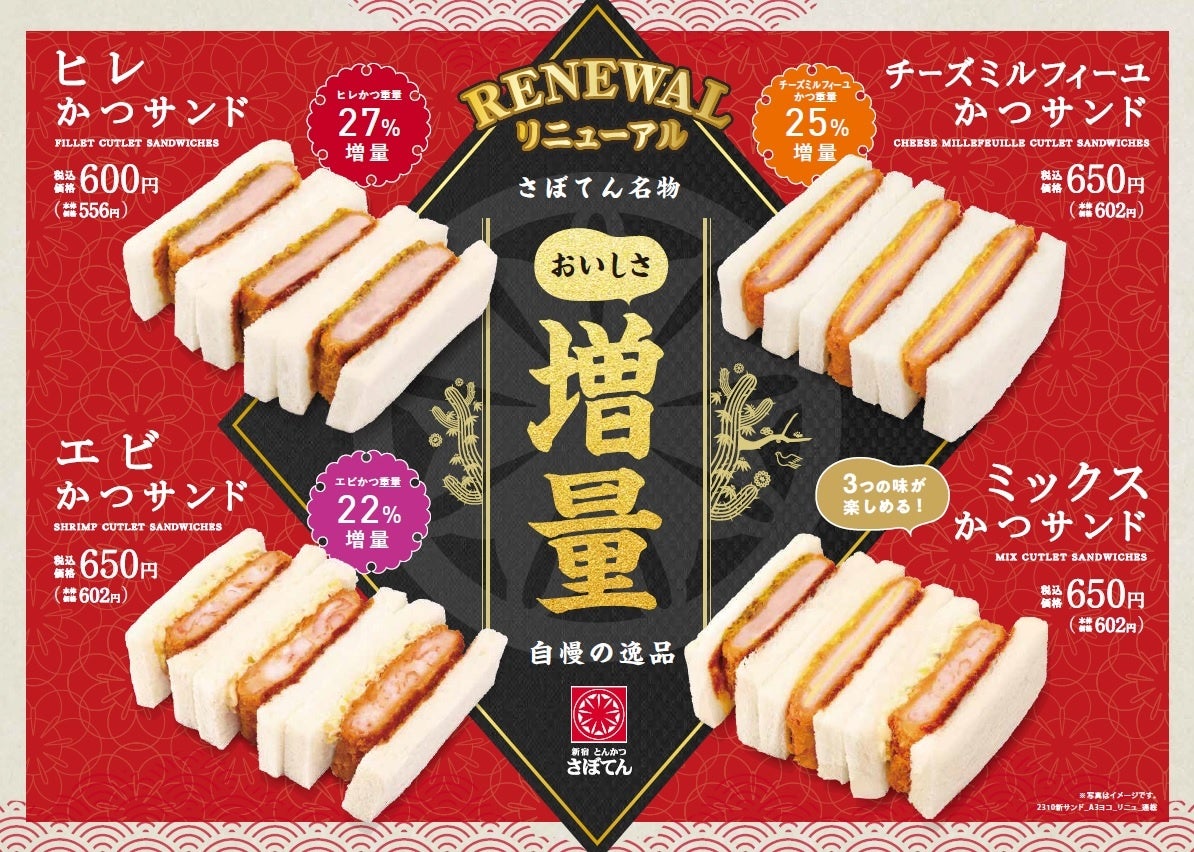 1966年創業「とんかつ新宿さぼてん」の3種のかつサンド おいしさ増量し10/25よりリニューアル販売開始