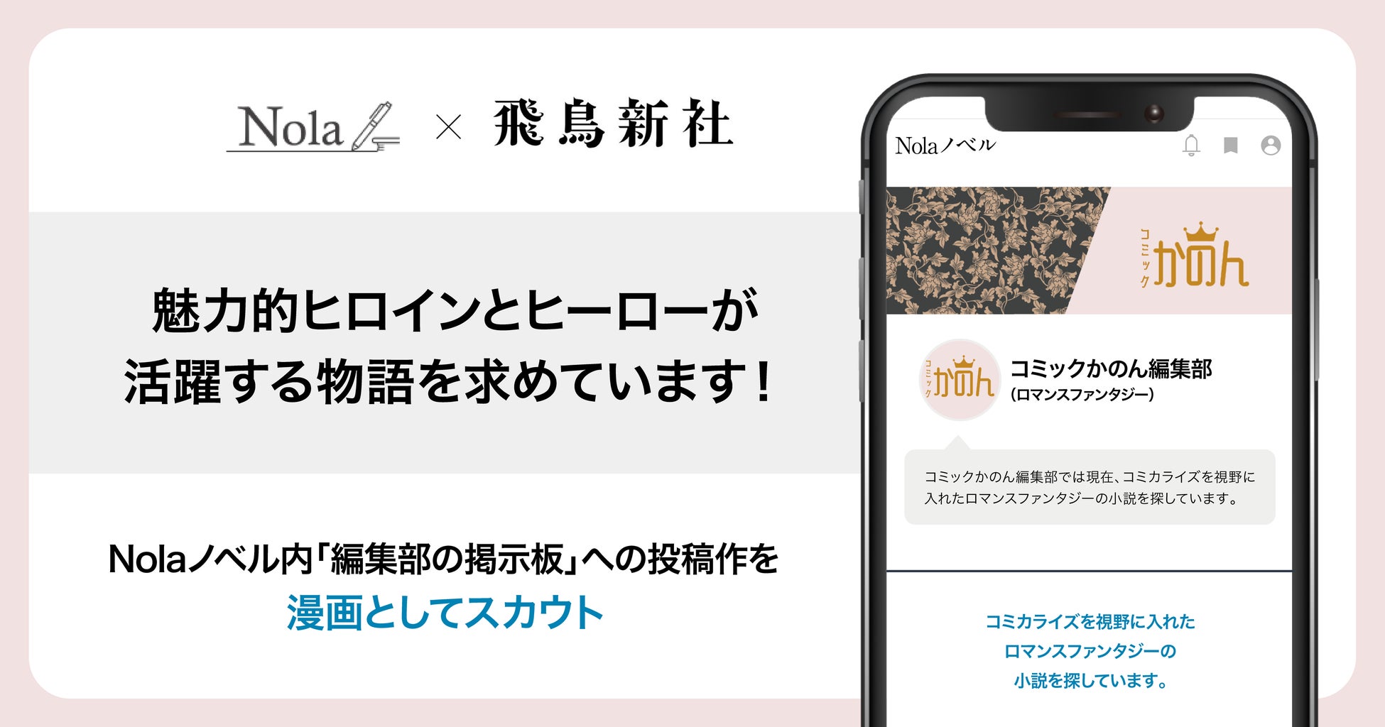 このたびの取り組みでは、indentの運営する「Nola」の持つ作家数50万人超・総制作数180万超の会員基盤と、Nolaノベルの『編集部の掲示板』機能を活かして、コミックかのん編集部の求める作品の募集・発掘を促進いたします。また、ベストセラー書籍およびコミックの制作に豊富なノウハウを持つ飛鳥新社の強みを掛け合わせ、原作の発掘から制作、配信まで、良質で一気通貫したコミック制作を目指してまいります。