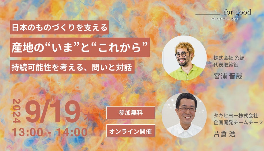 1751年創業の繊維商社タキヒヨー株式会社(本社:名古屋市西区、代表取締役 社長執行役員:滝 一夫)は、サステナブルやファッションのこれからについて「みんなで語り、考える」がコンセプトのオウンドメディア「__ for good(ブランク フォー グッド)」において、第3回ウェビナー「日本のものづくりを支える産地の“いま”と“これから”」を9月19日(木)13時より開催します。