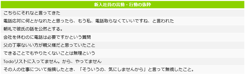 新入社員(新卒1年目)の言動で驚いたことについて自由回答で聞いたところ、前年にも増して、想像もつかない言葉遣いや、LINEでの欠勤連絡・退職代行利用・親の介入など、驚きの内容が多数ありました。