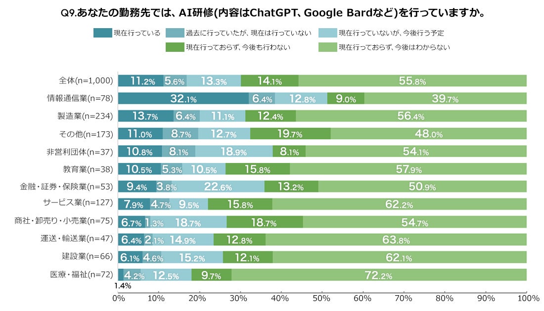 勤務先でAI研修(内容はChatGPT、Google Bardなど)を行っているかを聞いたところ、 「現在行っている」(11.2%)、「過去に行っていたが、現在は行っていない」(5.6%)を合わせると16.8%で、AI研修の経験者数は2割未満でした。