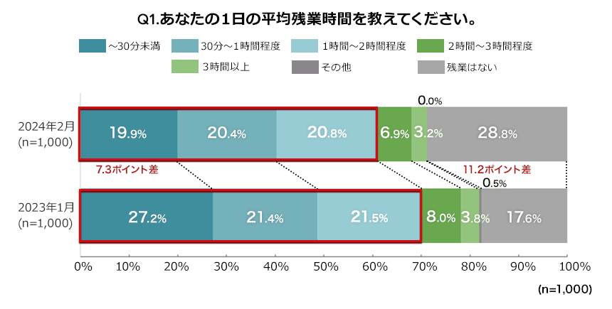 1日の平均残業時間を聞いたところ、2時間未満が6割(61.1%)で、前年(70.1%)と比較すると約1割下回り、残業時間が短縮傾向にあることが分かりました。