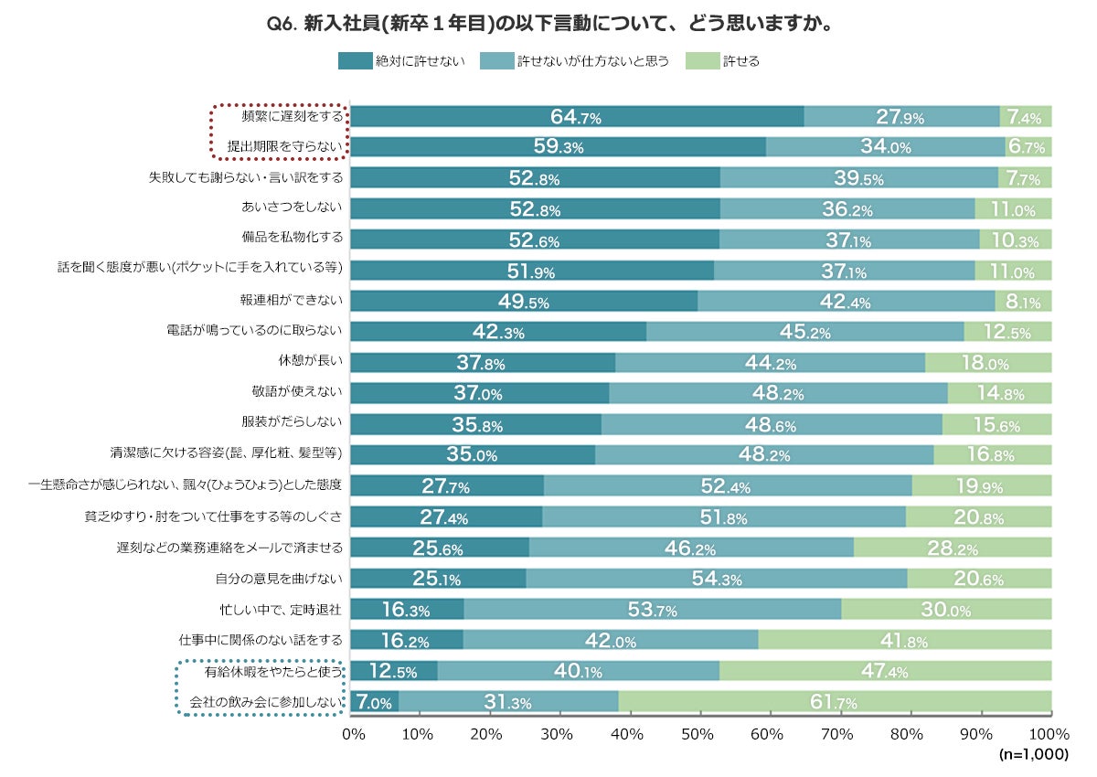 新入社員の言動『絶対に許せない』のトップ2は「頻繁な遅刻」(64.7%)、「提出期限を守らない」(59.3%)、飲み会不参加「許せる」が前年同様6割