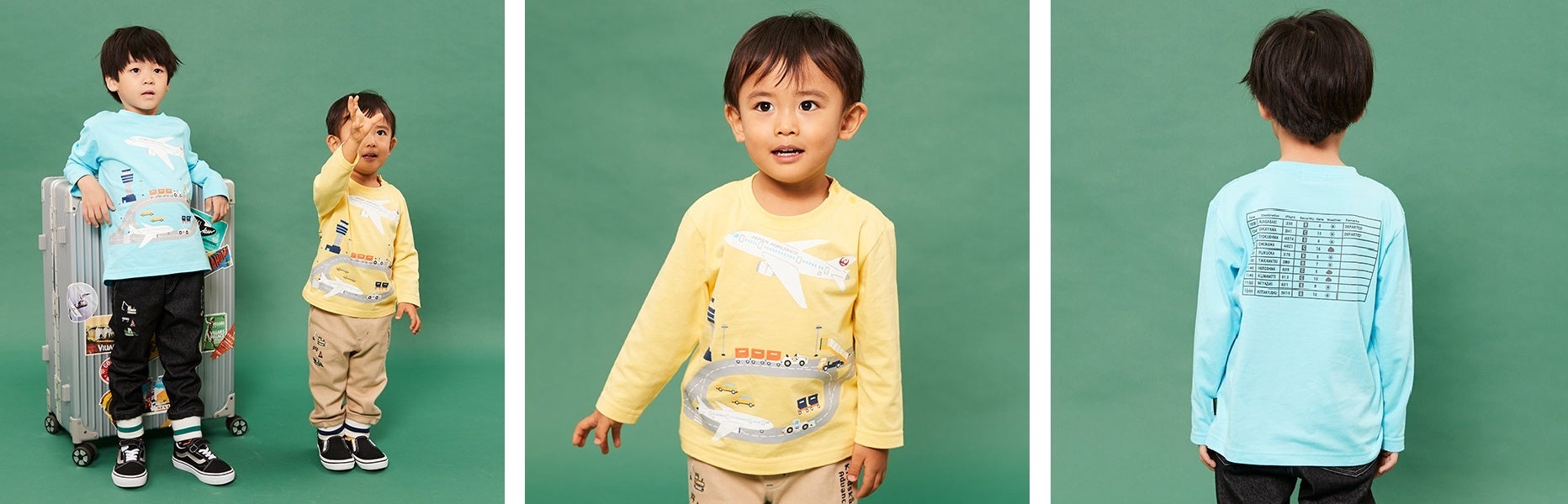 デザインは、恐竜と動物の搭乗シーン(インクブルー・赤)と滑走路シーン(黄・ライトブルー)の2パターン。どちらもクレードスコープがオリジナルで描き起こしたJAL航空機「ボーイング787-8」がデザインされています。バックスタイルにもこだわり、飛行機搭乗シーン柄はクレードスコープならではの恐竜&動物たちが飛行機に搭乗するシーンがTシャツのフロントからバックプリントに渡り描かれています。また、滑走路シーン柄のバックスタイルには電光掲示板がイラストされており、子供たちの想像力を膨らませるラインナップに。