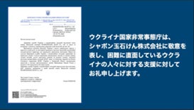 また、物資支援に関して、在ウクライナ日本国大使館 特命全権大使 松田邦紀様、駐日ウクライナ大使館 特命全権大使 コルスンスキー・ セルギー様、ウクライナ国家非常事態庁副長官(デジタル担当)ローマン・プリムシュ様より御礼のメッセージを頂戴しました。