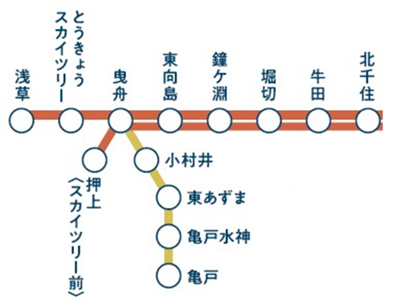 浅草駅、とうきょうスカイツリー駅、曳舟駅、亀戸駅、北千住駅、西新井駅、竹ノ塚駅、草加駅、