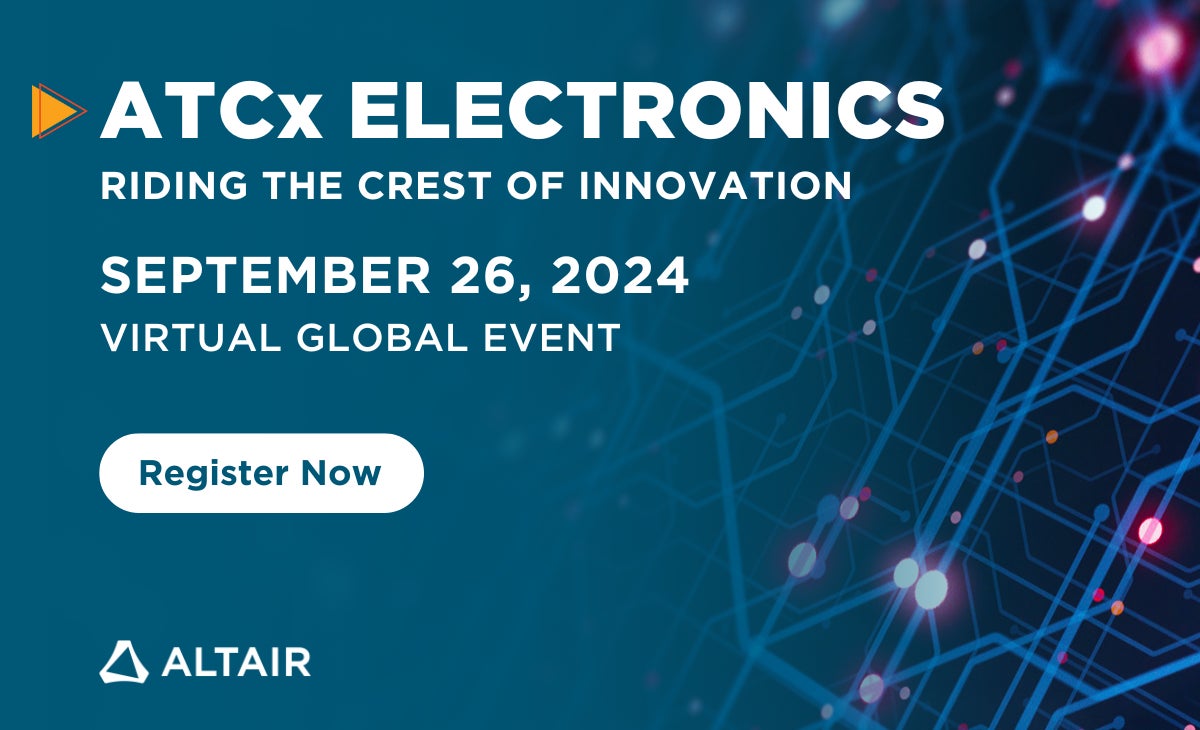 計算科学および人工知能(AI)の分野で世界をリードするアルテアエンジニアリング株式会社(日本本社: 東京都中央区京橋2-2-1 京橋エドグラン14階、代表取締役社長: 加園 栄一、本社:米国ミシガン州、CEO:James Scapa、Nasdaq:ALTR、以下:アルテア)は、グローバルオンラインイベント「ATCx エレクトロニクス 2024」を9月26日に開催します。このイベントでは、シミュレーションとAIがどのように業界全体の電子設計におけるブレークスルーを促進するかを紹介します。コラボレーションの強化、設計サイクルの短縮、ビジネス価値を高めるための実戦的なインサイトを導き出すためのヒントを共有します。