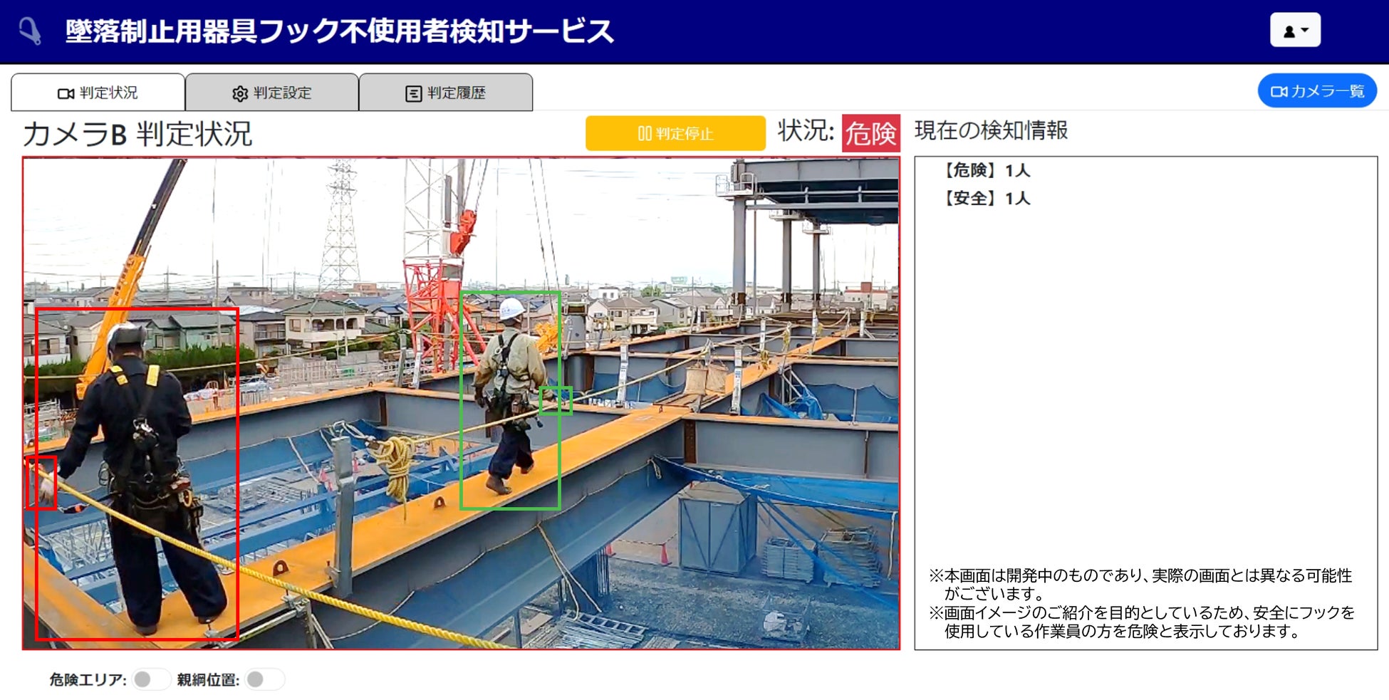 1.画像認識AI技術の活用により、鉄骨上作業におけるフック不使用者を検知し、通知(または警報)を発することで、不安全行動を抑止し、事故軽減に貢献