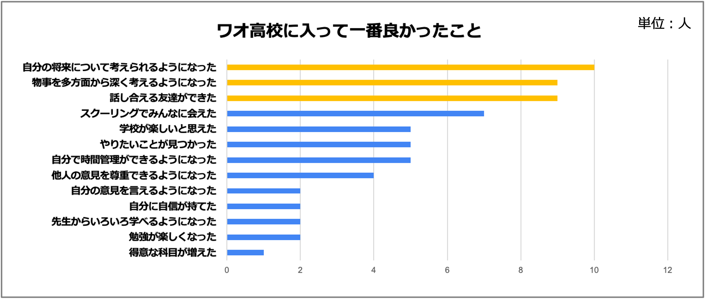 ワオ高校へ入学して一番良かったことという質問に対しては、①自分の将来について考えられるようになった。②物事を多方面から深く考えるようになった。③話し合える友達ができた。という結果になった。物事を多方面から深く考えれるようになったという回答は、教養探究、哲学の授業などの効果が考えられる。