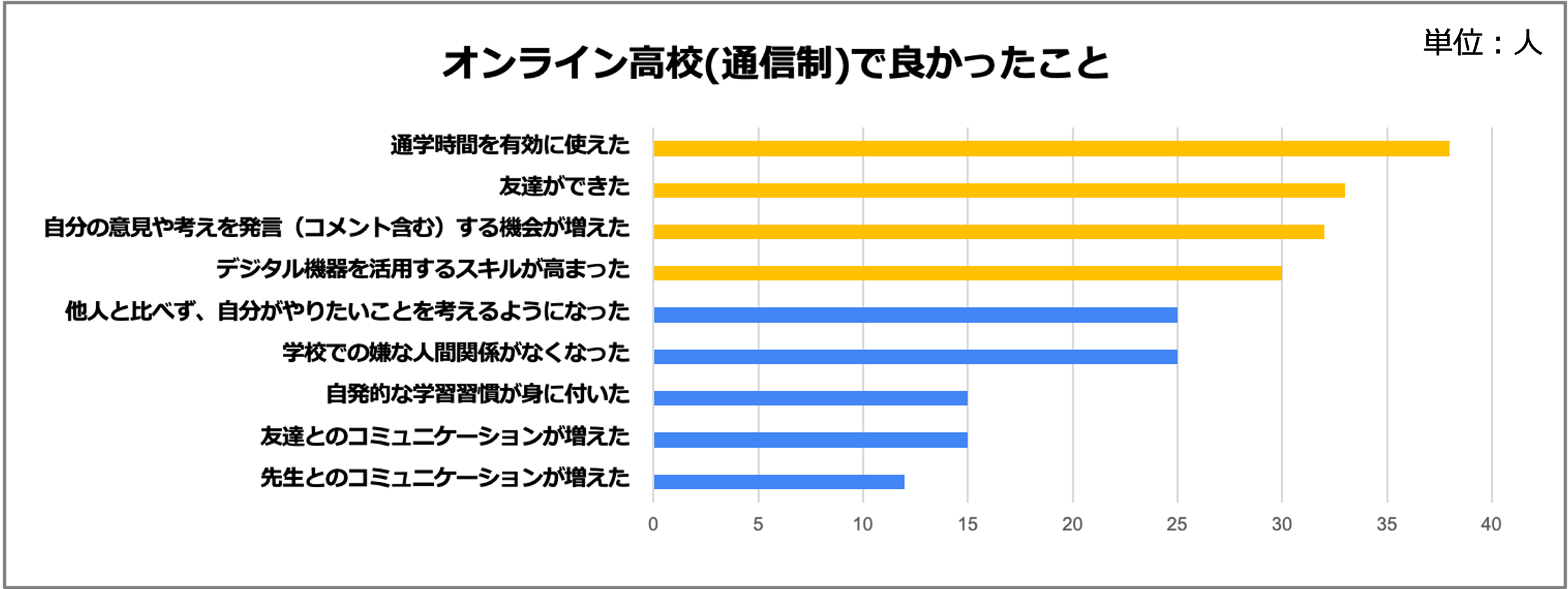 1)通信制高校への印象について、入学前より入学後の方が良いと答えた割合は31%upした。良かった理由の多くは、「通学時間が有効に使えた」「自分の意見や考えを発言する機会が増えた」「友達ができた」であった。
