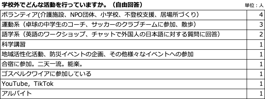 ワオ高生が学校の活動以外で取り組んでいることについての自由回答では、「ボランティア」と答えた生徒が4名おり、介護施設や不登校支援、小学校などでのボランティア参加は、ワオ高の教員も感心する結果となった。運動系でも「卓球の中学生のコーチ」や、語学系でも「チャットで外国人の日本語に対する質問に回答」など、積極的に社会活動に参加し貢献している様子がうかがえた。