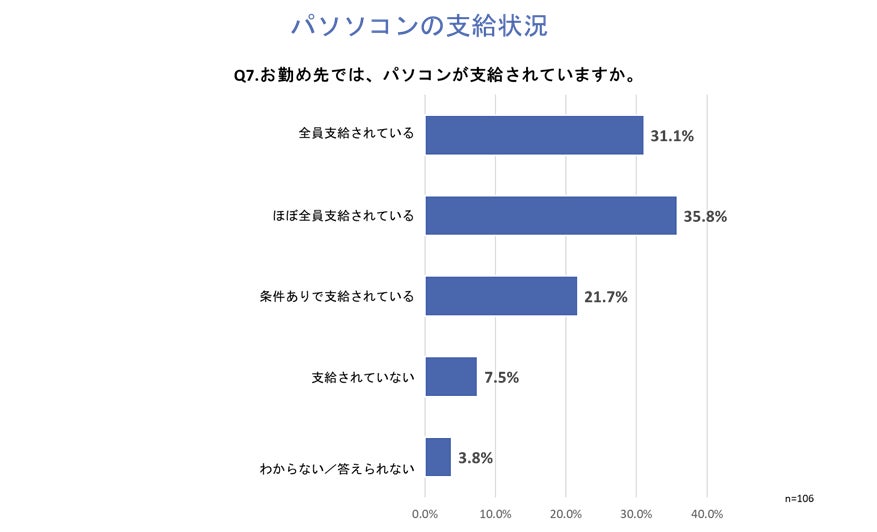 「Q7.お勤め先では、パソコンが支給されていますか。」と質問したところ、「ほぼ全員支給されている」が35.8%、「全員支給されている」が31.1%、「条件ありで支給されている」が21.7%という回答となりました。