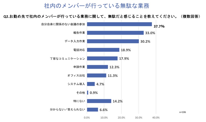 「Q2.お勤め先で社内のメンバーが行っている業務に関して、無駄だと感じることを教えてください。」と質問したところ、「自分自身に関係のない会議の参加」が37.7%、「報告作業」が33.0%、「データ入力作業」が30.2%という回答となりました。