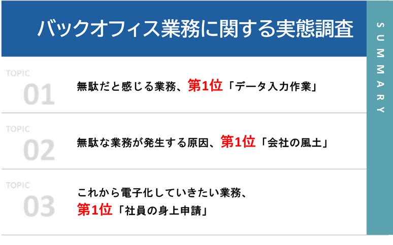 無駄だと感じる業務第1位は「データ入力作業」、無駄な業務が発生している理由第1位は「会社の風土」と回答!