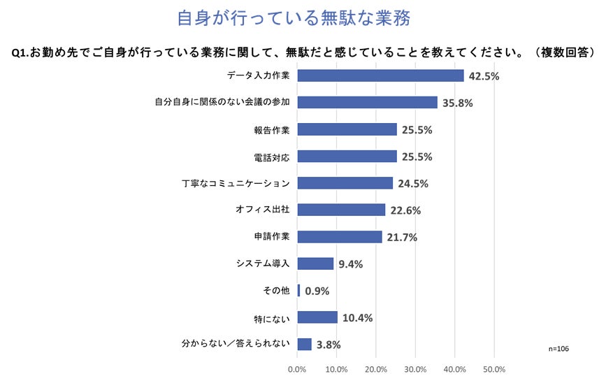 「Q1.お勤め先でご自身が行っている業務に関して、無駄だと感じていることを教えてください。」と質問したところ、「データ入力作業」が42.5%、「自分自身に関係のない会議の参加 」が35.8%、「報告作業」が25.5%という回答となりました。