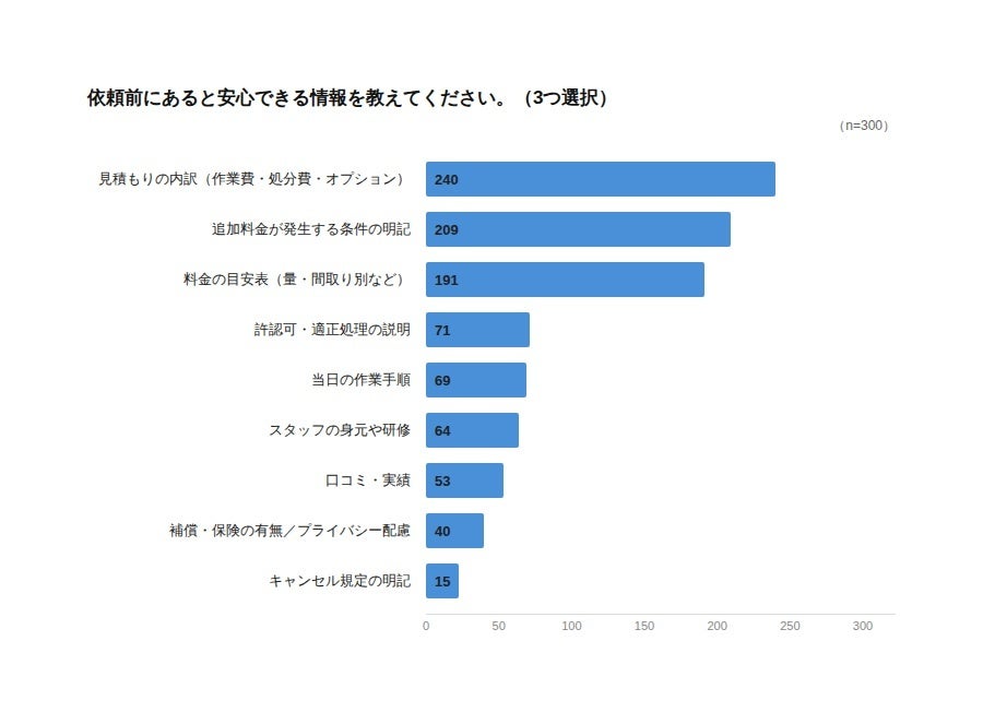また、依頼前にあると安心できる情報(3つ選択)でも、「見積もりの内訳(作業費・処分費・オプション)」240回答(80.0%)、「追加料金が発生する条件の明記」209回答(69.7%)、「料金の目安表(量・間取り別など)」191回答(63.7%)とトップ3がすべて料金関連でした。