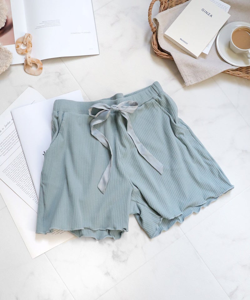 柔らかなリブ生地を使用したショートパンツは裾メロウ&サテンリボンでフェミニンに仕上げました。「ブライラズ」リブレースキャミソールとセットで着用すればおしゃれなルームウェアに早変わり!