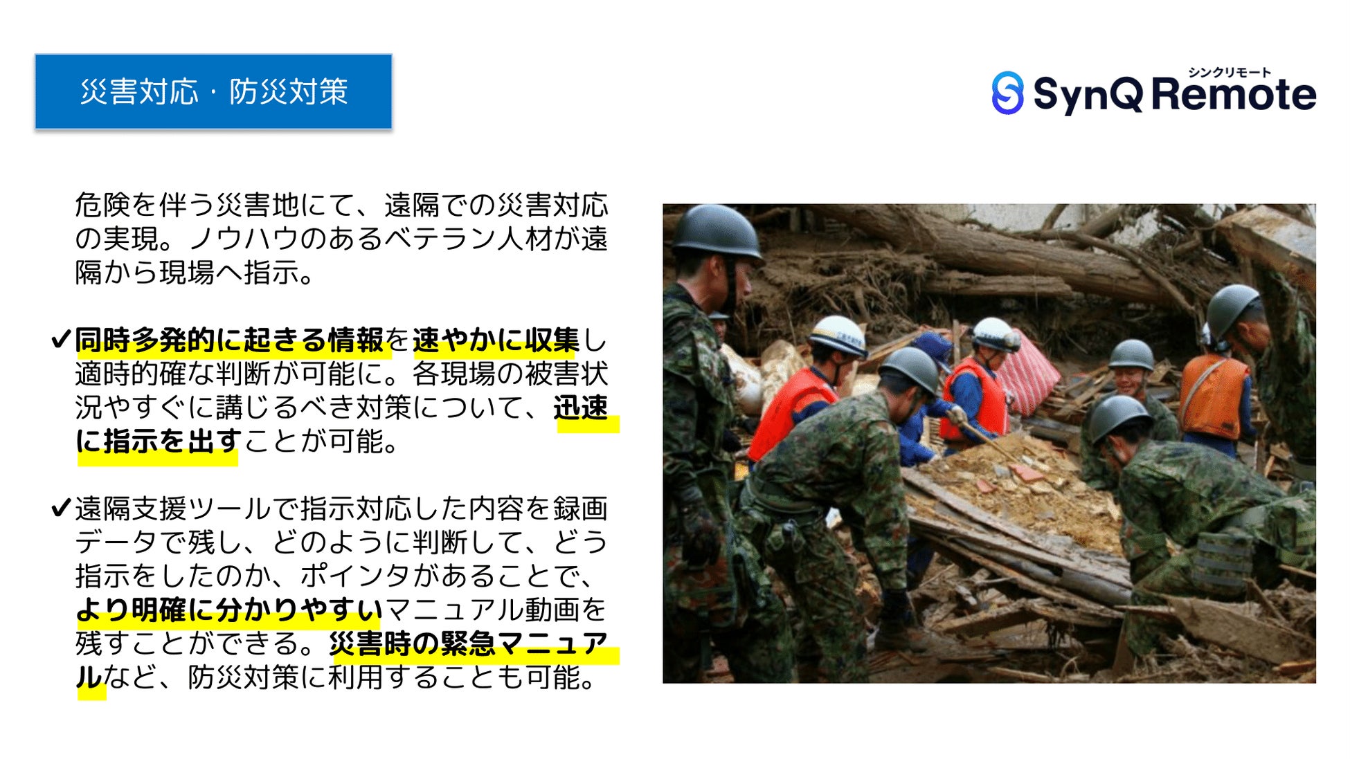 上記の課題に加え「災害時に現場判断ができる職員の不足」や「情報収集に時間がかかり、速やかな判断・対応が困難なこと」等の課題が山積している状態です。これらを解決するため、災害DX(遠隔支援)ツールとしてのSynQ Remoteの機能を紹介させていただきます。