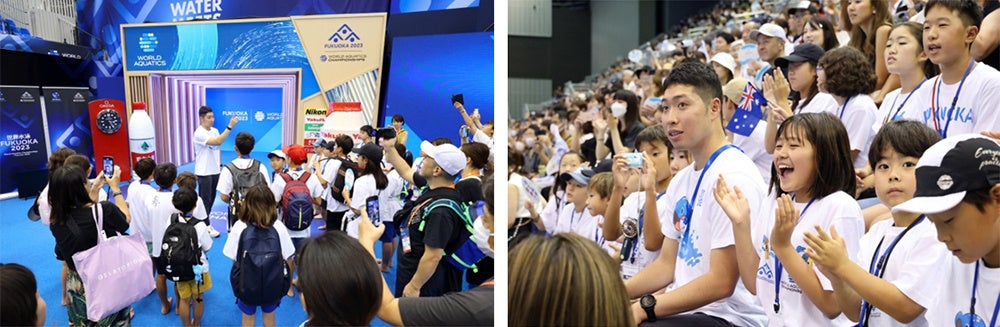 子どもたちと大会を観戦した萩野さんは、競泳観戦のポイントや注目選手について丁寧に説明。参加者は、メダリストによる豪華な解説を聞きながら、食い入るように世界の舞台を観戦しました。その後、メイン会場であるマリンメッセ福岡A館のバックヤードを巡り、競技直前の選手が待機するコールルームや、選手がメディアにインタビューを受けるミックスゾーンなど、普段、選手以外は立ち入ることができないエリアを見学しました。萩野さんと選手入場ゲートに立ち、レプリカメダルを首に提げながら記念写真に納まるサプライズもあり、子どもたちは満面の笑みを浮かべていました。