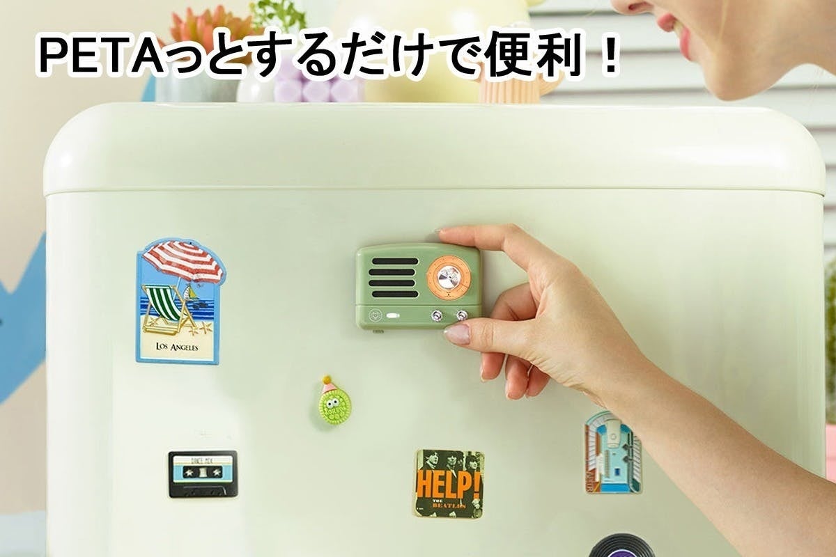 まるで、マグネットステッカーのような大きさとビジュアルで、磁気でピタッとくっつければ場所を取らずに好きな音楽を高音質かつ低音で大音量に再生可能