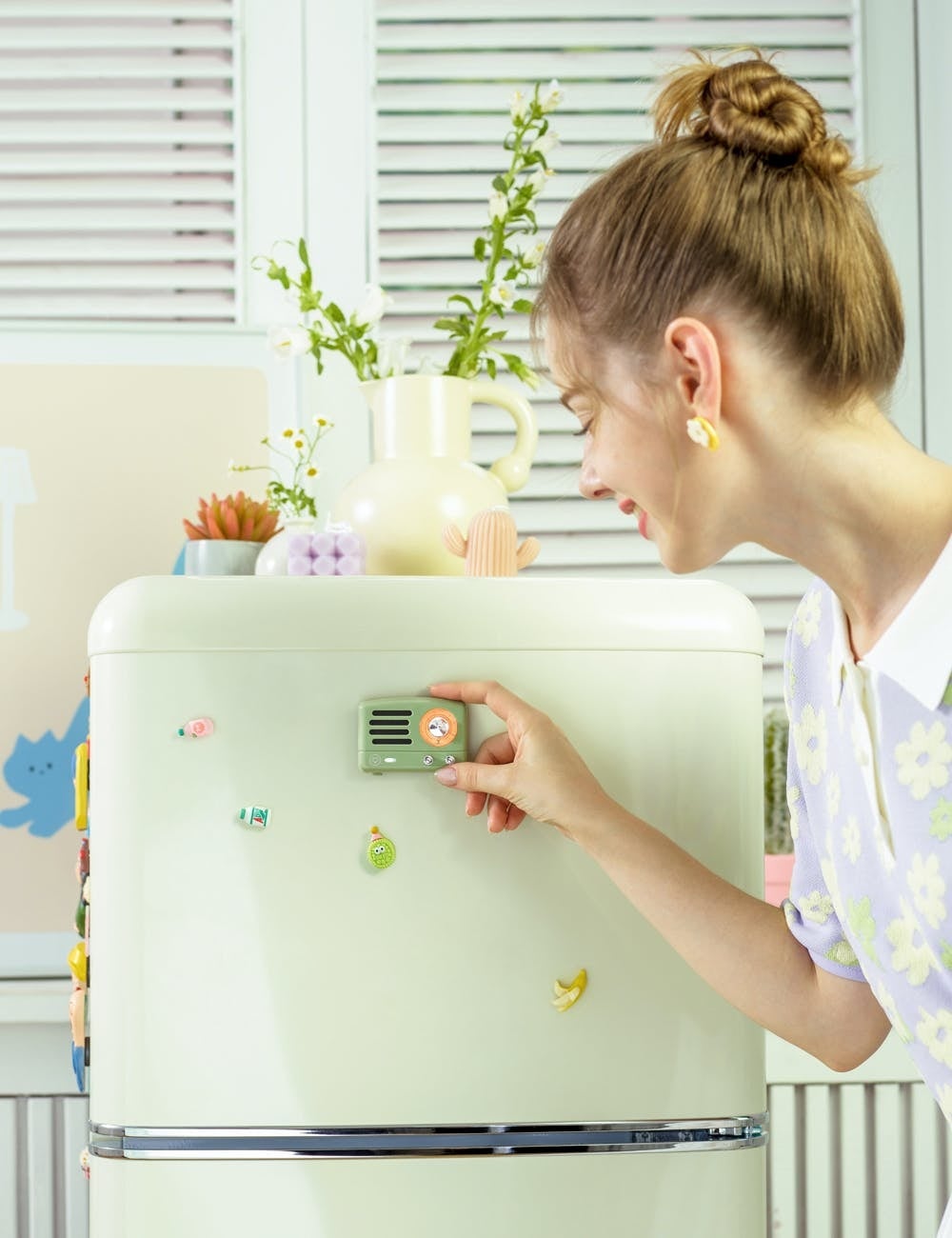 従来のスピーカーは置き型が主流ですが、ミニマリストが進む現代では最小限の機能とスペースを有効活用することが増えました。そんな現代のライフスタイルに合わせ1ダイヤルで音量と電源オン・オフができ、磁石で冷蔵庫等に貼ることで置き場に困らないスピーカーを開発しました。