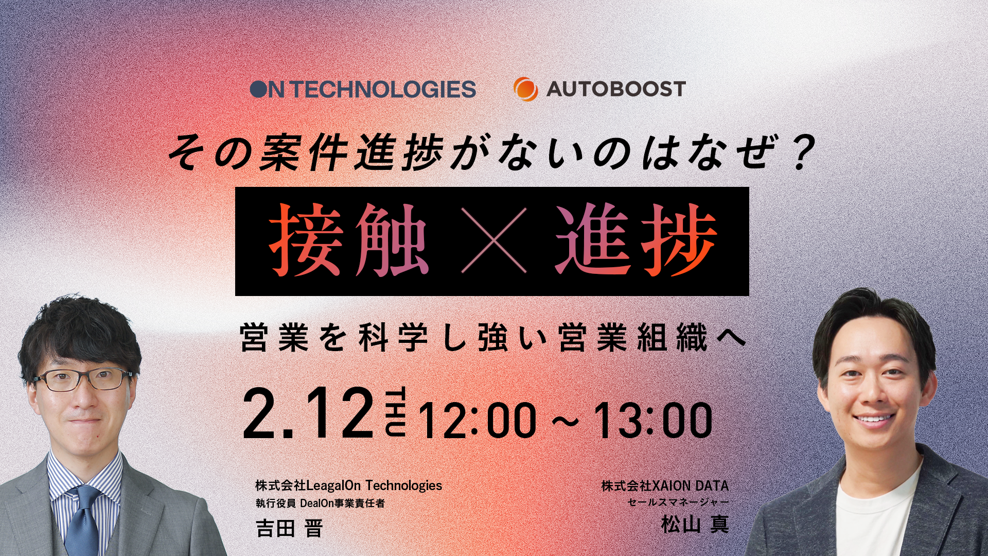 株式会社XAION DATA(本社:東京都千代田区、代表取締役:佐藤 泰秀)の運営するセールスインテリジェンスSaaS「AUTOBOOST(オートブースト)」は、2026年2月12日(火)に株式会社LegalOn Technologiesと共催セミナー「その案件進捗がないのはなぜ?キーマン接触×進行の改善で営業を科学し、強い営業組織へ」を開催いたします。