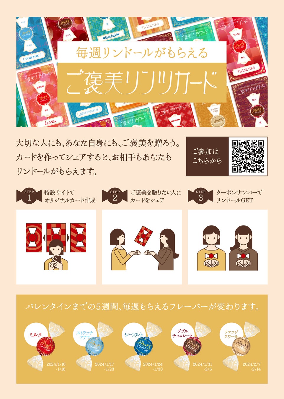 特設サイトでは、大切な人にオリジナルメッセージとともにリンドールを贈れる『ご褒美リンツカード』企画を展開しています。バレンタインまでの5週間、毎週参加すれば、5つのフレーバーのリンドールを店頭で受け取ることができます。25種のオリジナルカードから10種のメッセージをセレクトいただけます。