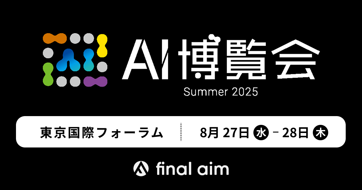 株式会社Final Aim(本社:米国デラウェア州 / 代表取締役社長:朝倉 雅文、取締役:横井 康秀、以下 Final Aim)は、2025年8月27日(水)~28日(木)に東京国際フォーラム ホールEにて開催される「AI博覧会 Summer 2025」に出展します。どなたでも無料で入場いただけますので、ふるってご参加ください。