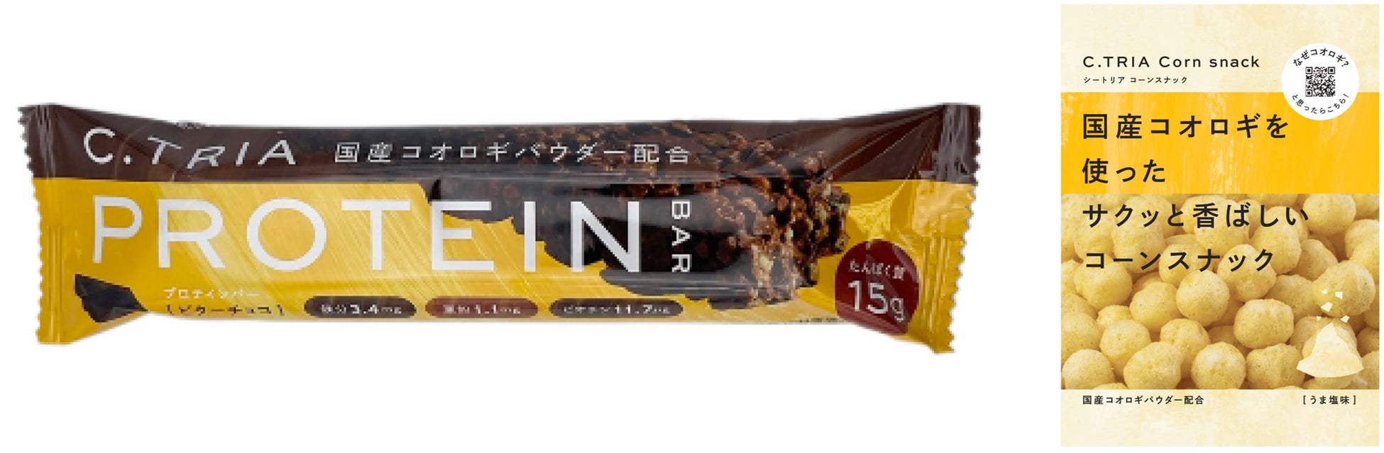 C. TRIA プロテインバー ビターチョコ味、C. TRIA プロテインバー ココナッツ味、C. TRIA コーンスナック うま塩味、C. TRIA コーンスナック たこやき味