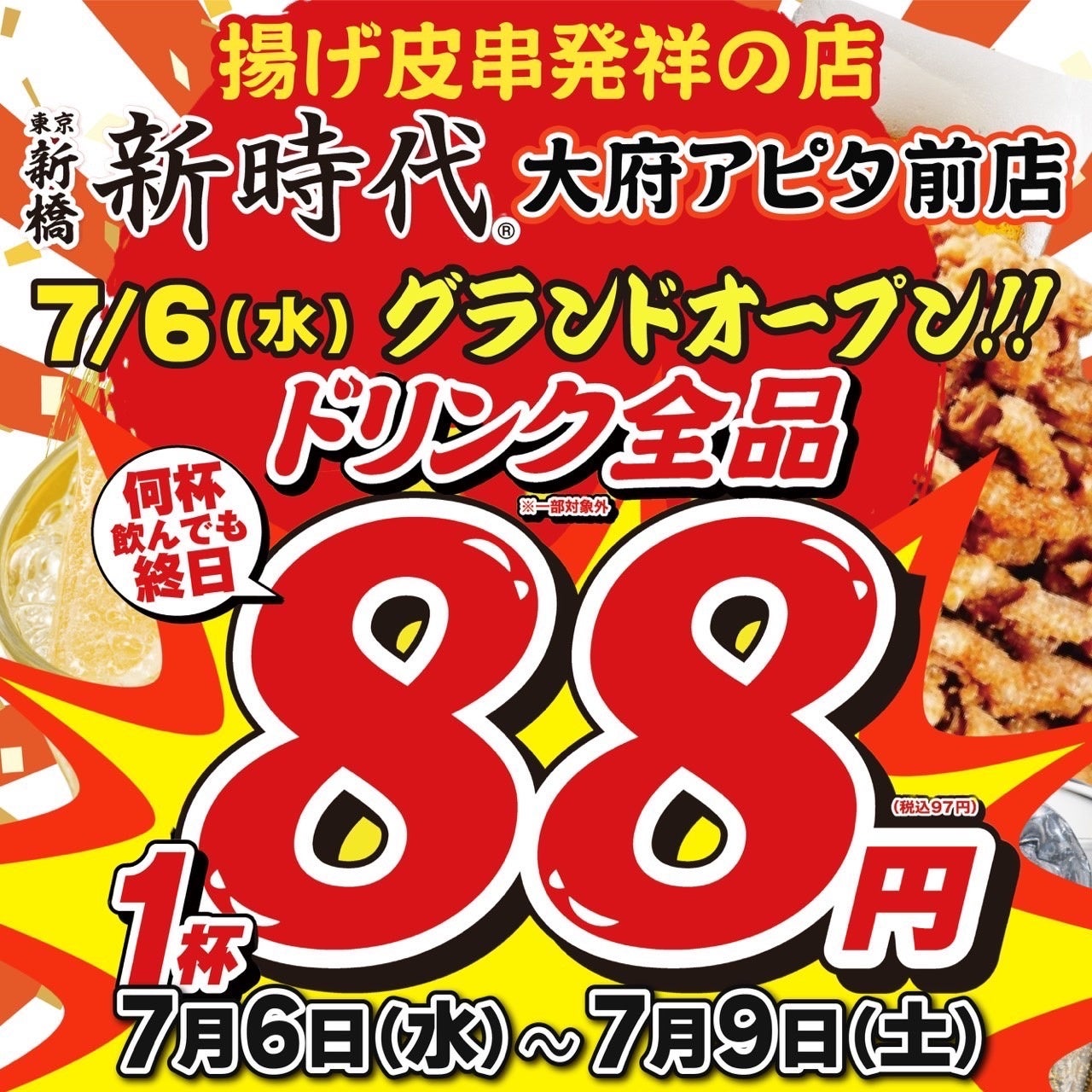 「新時代 大府アピタ前店」のオープンを記念し、ドリンク全品を1杯88円(税込97円)でお楽しみ頂けるキャンペーンを開催します。