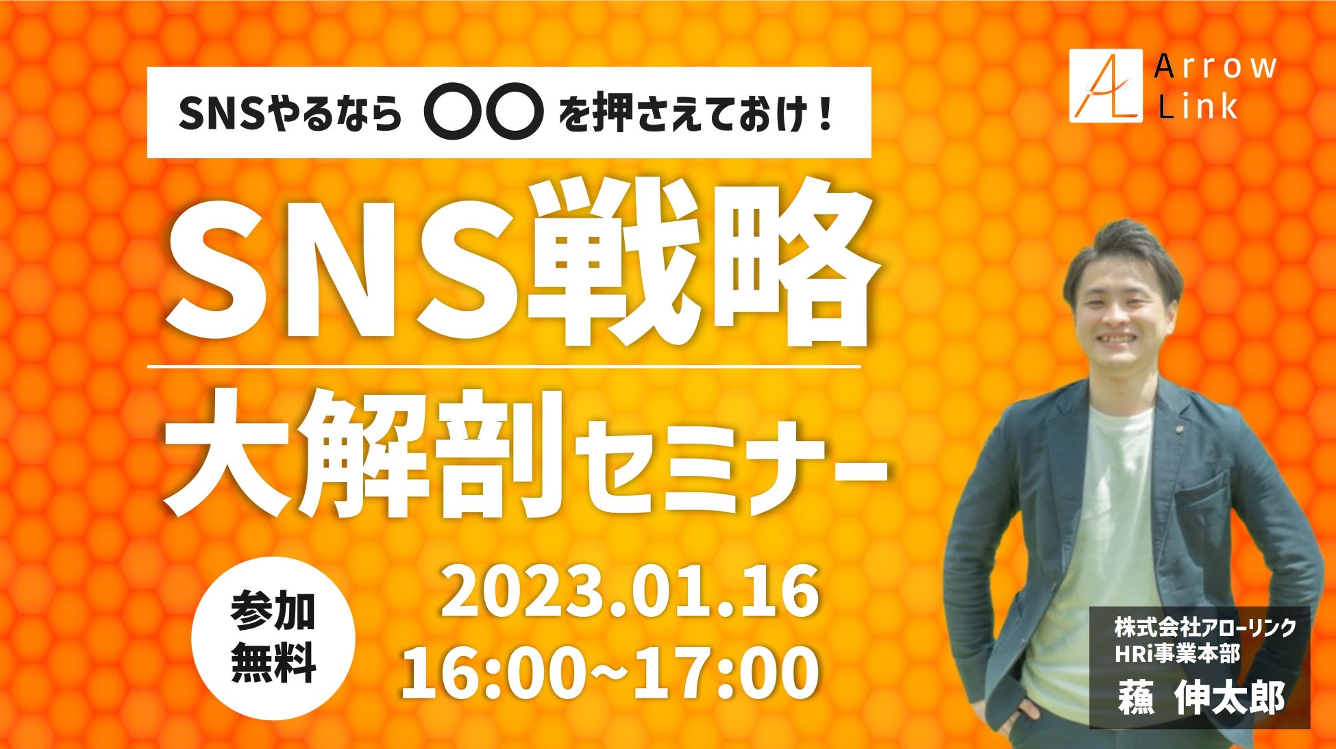 株式会社アローリンク(本社:兵庫県神戸市、代表取締役:蓬莱和真)は、2023/01/16(月)にSNS採用実施企業様向けのオンラインセミナーを無料で開催します。「SNSやるなら〇〇を押さえておけ!SNS戦略大解剖セミナー!」と題し、コロナ禍に最適な"SNSを活用した採用戦略"について詳しくお伝えします。