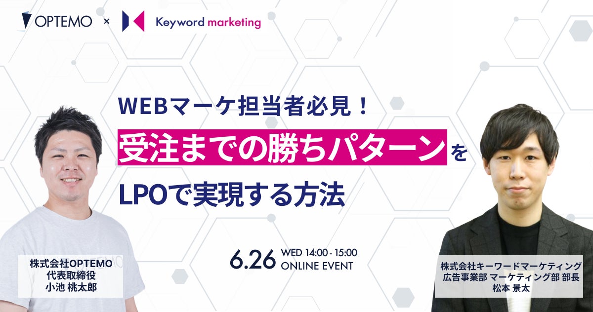 株式会社ベクトル(本社:東京都港区、代表取締役会長兼社長:西江 肇司、東証プライム:6058)の子会社である株式会社キーワードマーケティング(本社:東京都港区、代表取締役会長:滝井 秀典)は、株式会社OPTEMO(本社:東京都千代田区、代表取締役:小池桃太郎、以下OPTEMO)と共同で、無料オンラインセミナー『受注までの勝ちパターンをLPOで実現する方法 新規リード獲得のためのWeb広告戦略&サイト上で商談できる“OPTEMO”も紹介』を6月26日(水)14時より開催いたします。