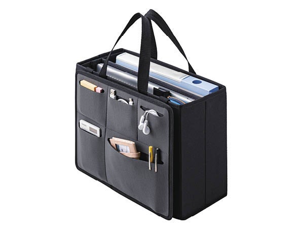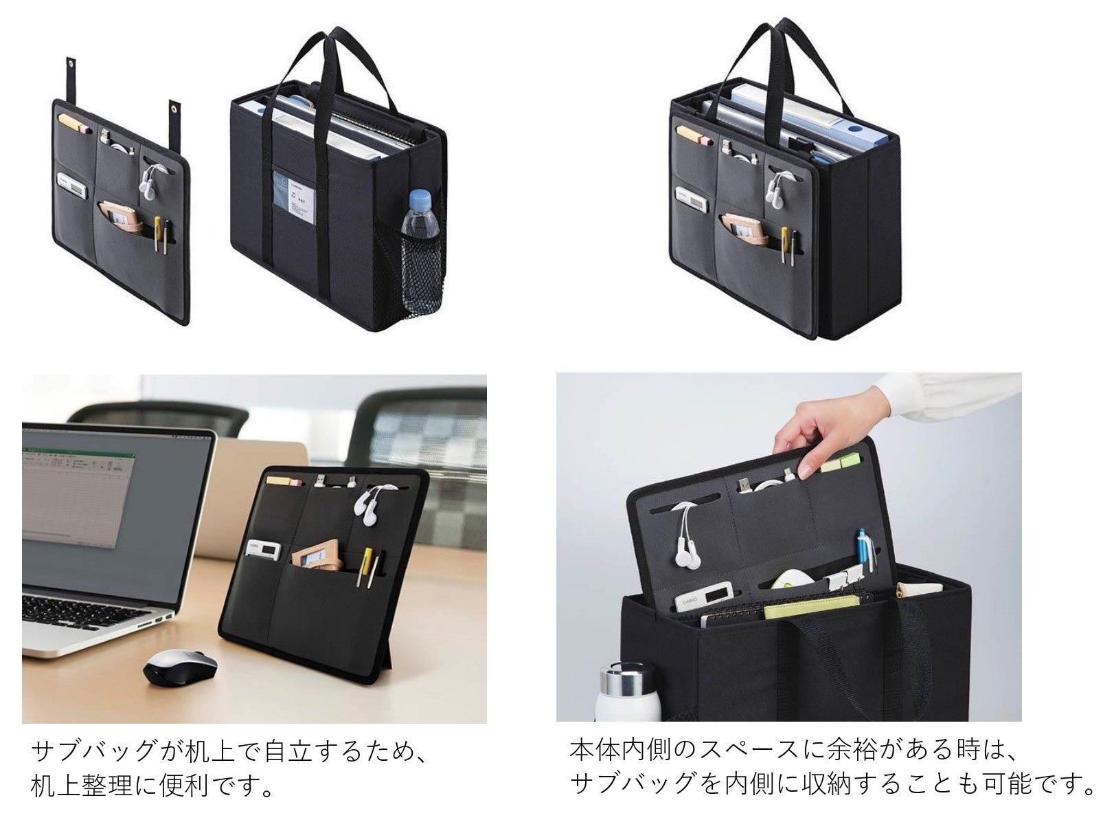 取り外し可能で机上に自立するサブバッグ付きの本商品は、モバイル端末や文房具等を効率的に整理し携帯することができます。また、本体内側のスペースに余裕がある際には、サブバッグを内側に収納しコンパクトに持ち歩くことも可能で、その時々のニーズに合わせて柔軟に活用することができる商品です。
