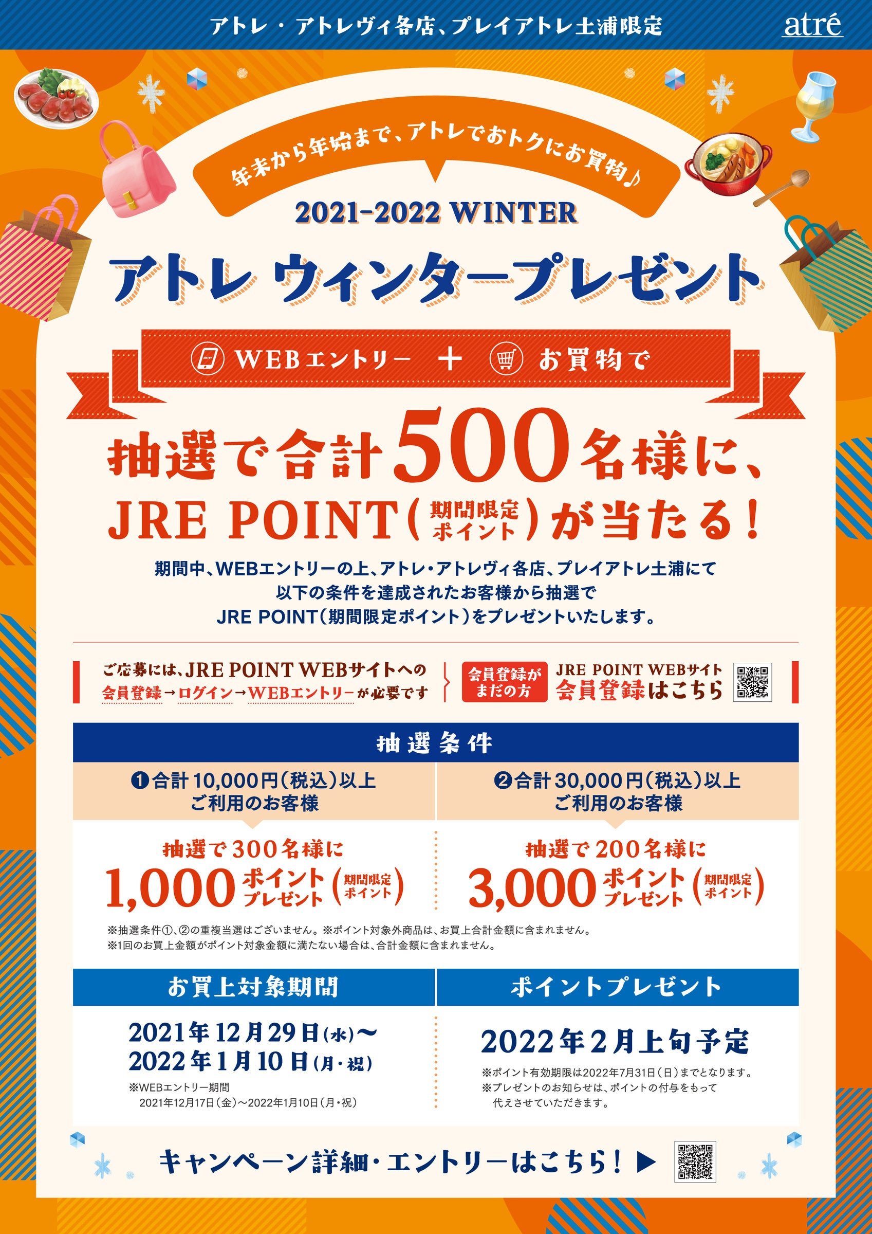 下記期間中、WEBエントリーのうえ、アトレ・アトレヴィ各店、プレイアトレ土浦で以下の条件を達成されたお客様から抽選で合計500名様にJRE POINT(期間限定ポイント)をプレゼントいたします!