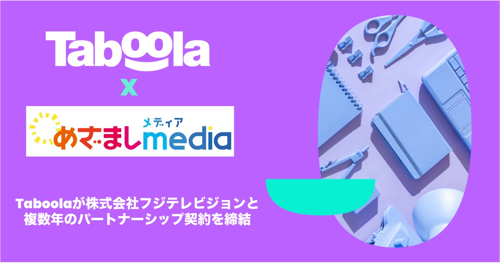 本日2024年9月10日、世界最大のディスカバリープラットフォームカンパニーTaboolaは、株式会社フジテレビジョン(以下、フジテレビ)との間で、ネイティブ広告分野において複数年の独占契約を締結したことを発表いたします。このパートナーシップの下、フジテレビは新サイト『めざましmedia』においてTaboolaが提供するコンテンツディスカバリープラットフォームを活用し、パーソナライズされたコンテンツ体験と広告を全国のユーザーに届けます。(*1)
