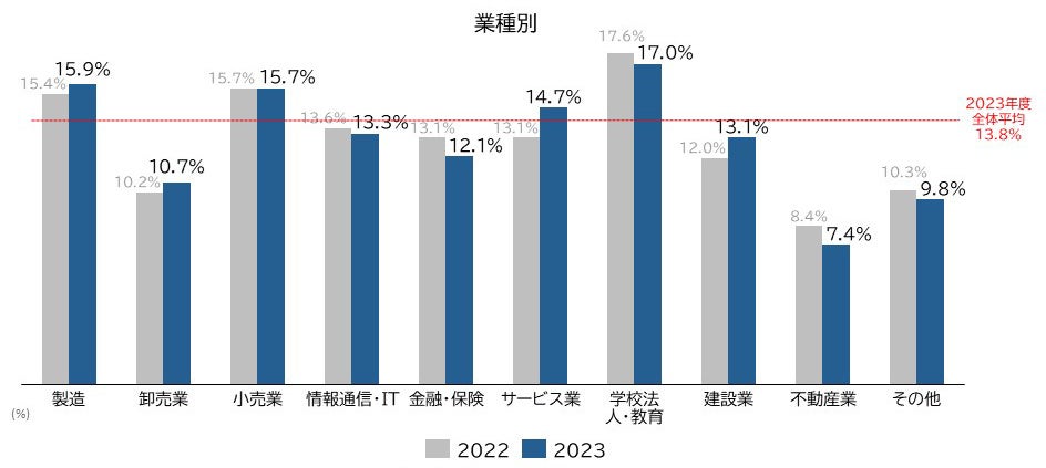 昨年同様に「学校法人・教育」「製造」「小売業」で高ストレス者率が高い結果となりました。