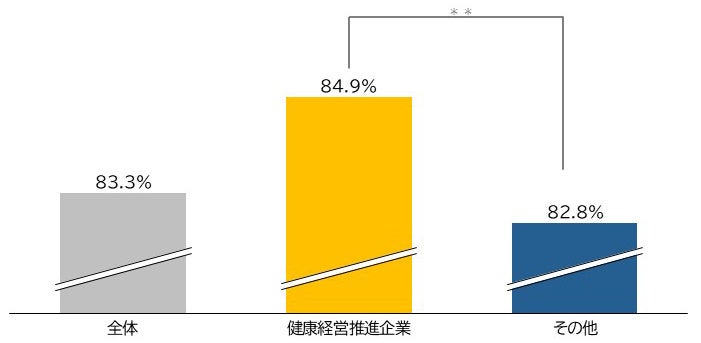 健康経営を推進している企業とその他の企業で比較すると、健康経営推進企業で84.9%、その他の企業で82.8%と有意な差が見られ、プレゼンティーズムによる損失が低いという結果となりました。