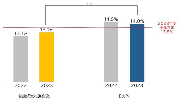 高ストレス者率について、健康経営を推進している企業で13.1%、その他の企業で14.0%と有意な差が見られた。
