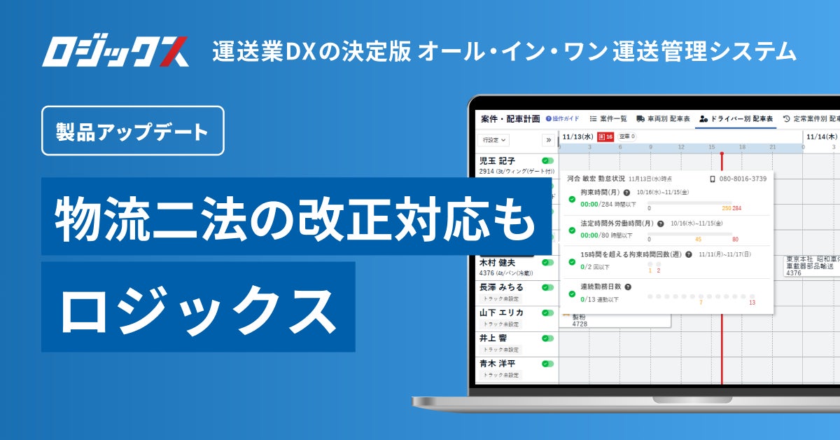 物流DXを推進するアセンド株式会社(本社:東京都新宿区、代表取締役:日下瑞貴、以下「当社」)は、トラック運送事業者向けに提供している業務管理クラウドシステム「ロジックス」において、物流関連二法の改正により、2025年4月1日より対応が求められる事項に対応した機能の提供を開始することをお知らせいたします。