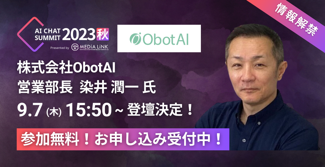 【ObotAI営業部長 染井氏、登壇決定!】すべてのカスタマーサポートへ贈るAIチャットボットの祭典「AI CHAT SUMMIT 2023秋」9/7木10:00~18:00開催!