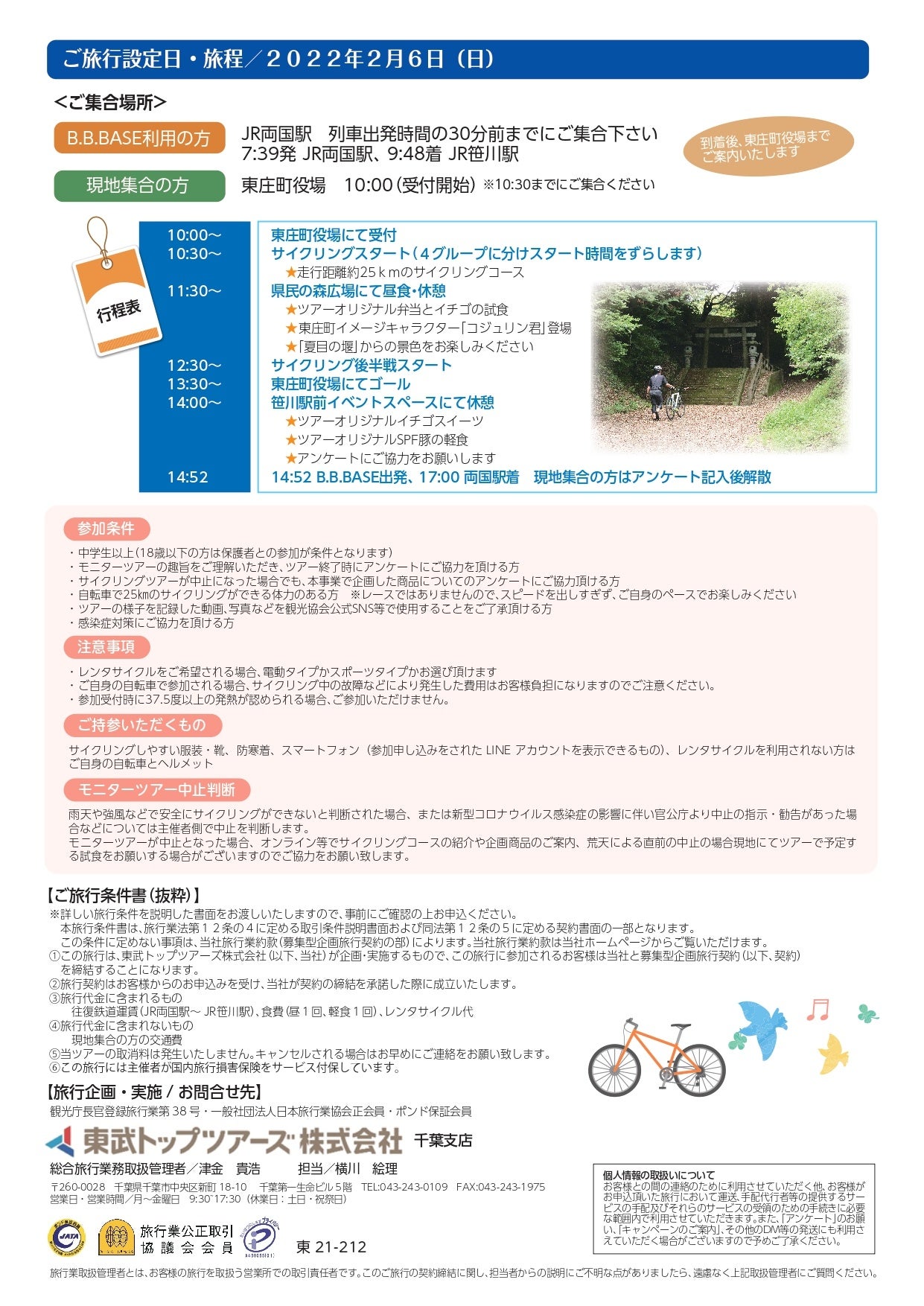 東武トップツアーズ株式会社(本社:東京都墨田区、社長:百木田康二)は、東庄町観光協会主催のもと、株式会社千葉銀行(頭取:米本努)と共に観光庁の「地域の観光資源の磨き上げを通じた域内連携促進に向けた実証事業」として、2月6日(日)に千葉県東庄町で開催される「とうのしょうサイクリングデー」のモニターツアー参加者を募集しますので、お知らせいたします。
