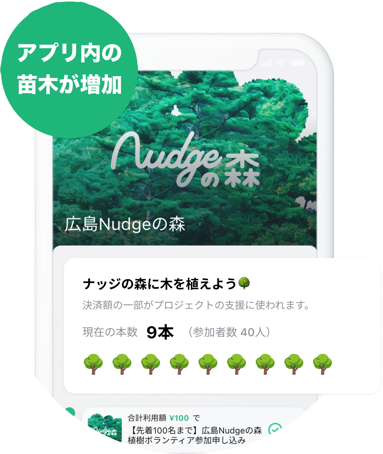 2022年11月には、プロジェクトの関係者のほか、地域の子供たち、協賛スポーツチームのメンバーが集まって、ボランティアで実際にNudgeの森に苗木を植える会員限定の「広島Nudgeの森」植樹イベントも予定しています。キャッシュレスでの応援だけではなく、ユーザー自身の社会貢献を自分の目で見て、手で触れて体験できるオフラインの機会も提供します。