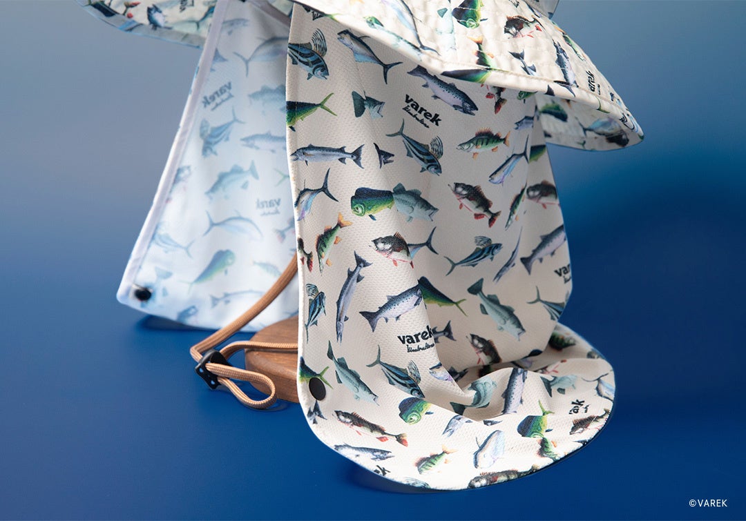 フロントにVarekのロゴとアートワークを刺繍したキャップ。表地には撥水・防汚加工、裏地には吸水加工を施したオリジナルの総柄生地を使用して、シンプルなキャップに機能性と遊び心をプラスしました。ご家庭での手洗いも可能な、デイリーユースにぴったりのアイテムです。